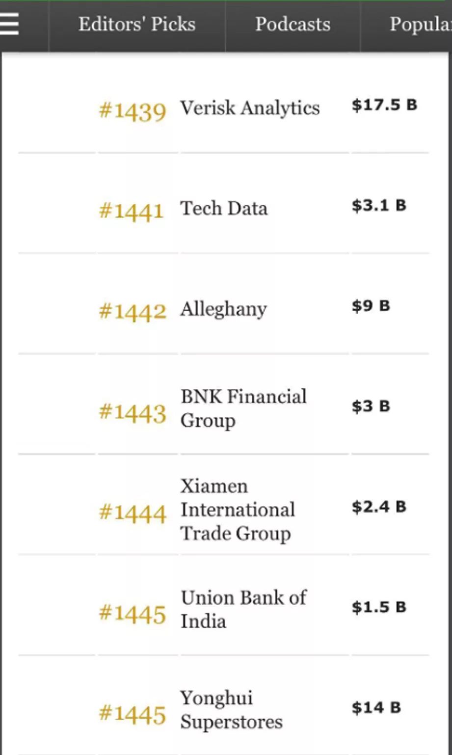 福布斯全球上市公司2000強(qiáng)從2003年起一年發(fā)布一次,薈集了全球最大規(guī)模的上市公司。今年的榜單包含了60個(gè)國家和地區(qū)的上市公司,中國內(nèi)地和中國香港有291家企業(yè)上榜。