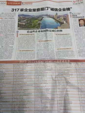 由廈門市誠(chéng)信促進(jìn)會(huì)及相關(guān)職能部門聯(lián)合開(kāi)展的“2012—2013年度廈門市誠(chéng)信示范企業(yè)”評(píng)選結(jié)果日前出爐,今天,廈門國(guó)貿(mào)與其它摘得金牌的316家標(biāo)桿企業(yè)一起接受了表彰。