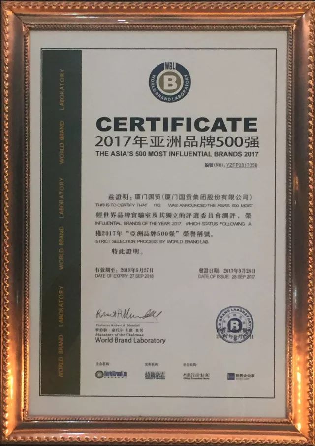 由世界品牌實(shí)驗(yàn)室和世界經(jīng)理人集團(tuán)共同編制和發(fā)布的2017年《亞洲品牌500強(qiáng)》排行榜于9月28日在香港揭曉, 這是世界品牌實(shí)驗(yàn)室第十二次對(duì)亞洲品牌的影響力進(jìn)行的測(cè)評(píng), 共有20個(gè)國(guó)家和地區(qū)的500個(gè)品牌入選。本年度《亞洲品牌500強(qiáng)》排行榜中,共有來(lái)自金融、食品飲料、電子電器、傳媒、通信電子IT等在內(nèi)的37個(gè)相關(guān)行業(yè)的品牌入選。廈門(mén)國(guó)貿(mào)集團(tuán)股份有限公司首次進(jìn)入這個(gè)榜單,位列本次亞洲品牌500強(qiáng)榜單第358位。