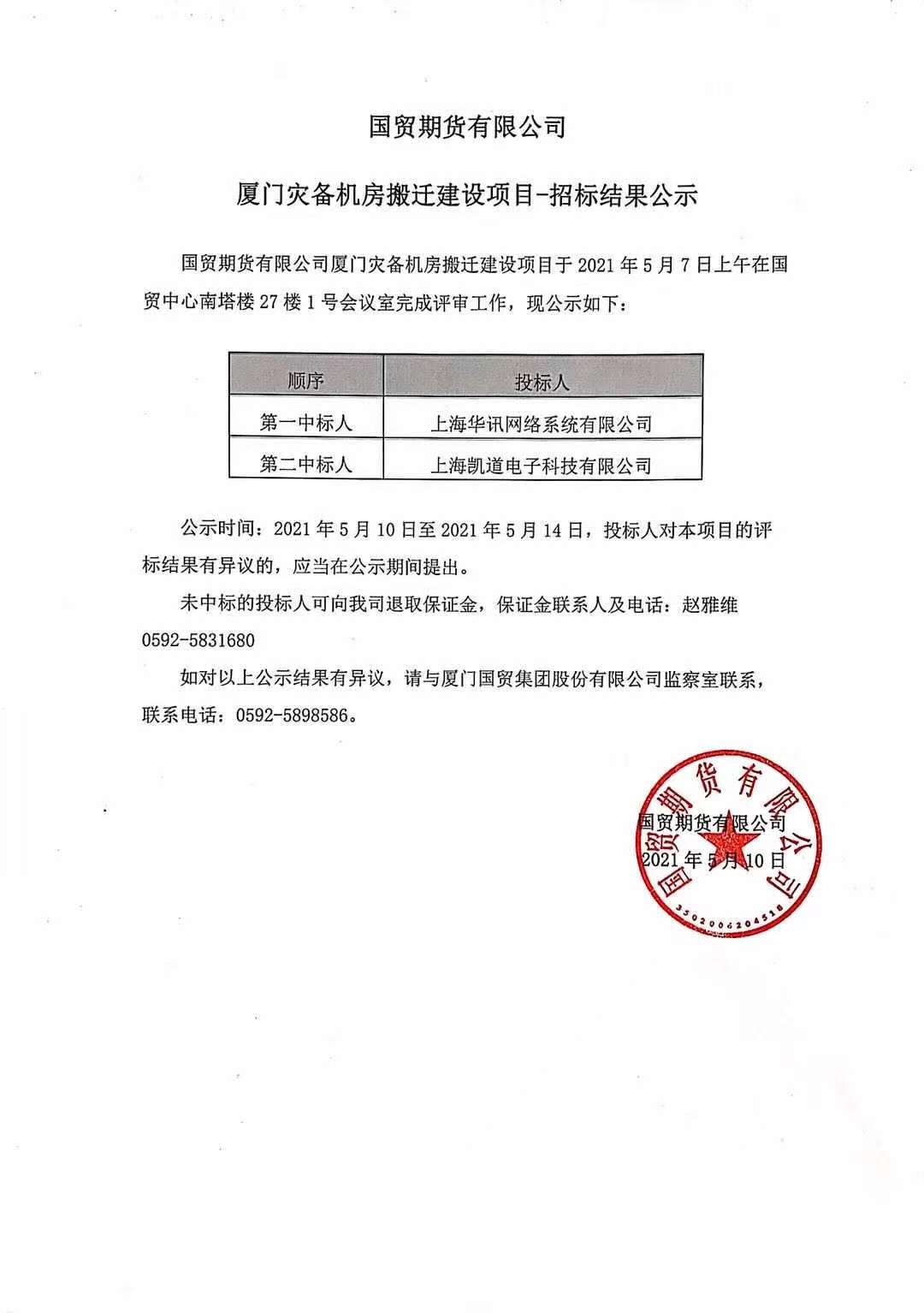 國(guó)貿(mào)期貨廈門災(zāi)備機(jī)房搬遷建設(shè)項(xiàng)目招標(biāo)結(jié)果公示