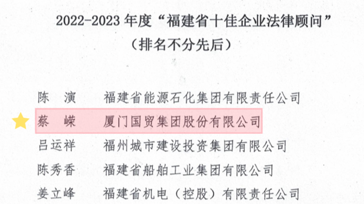 國貿(mào)股份榮獲“2022-2023年度福建省企業(yè)法治工作先進(jìn)單位”“十佳法律顧問”等兩項(xiàng)稱號。