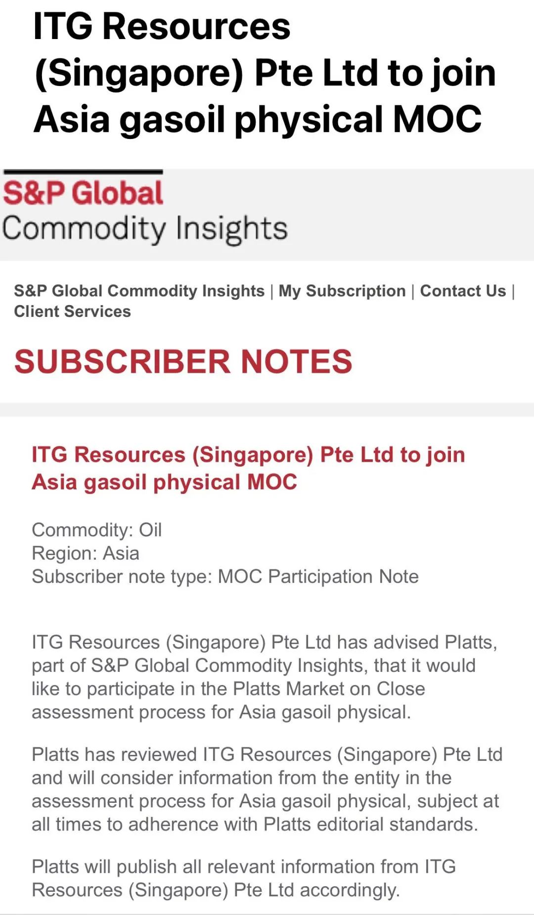國貿(mào)股份旗下ITG Resources獲得普氏柴油亞洲市場窗口交易資格,這是國貿(mào)股份繼2022年6月 ITG Amoy 輪取得燃料油普氏市場窗口交易資格后,再度參與全球油品市場定價。